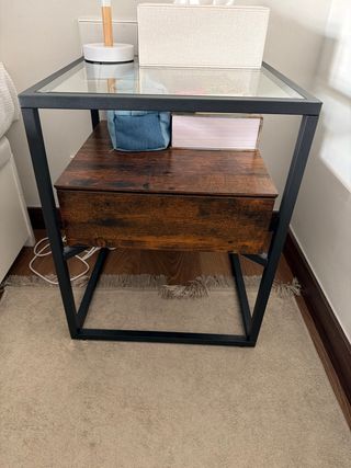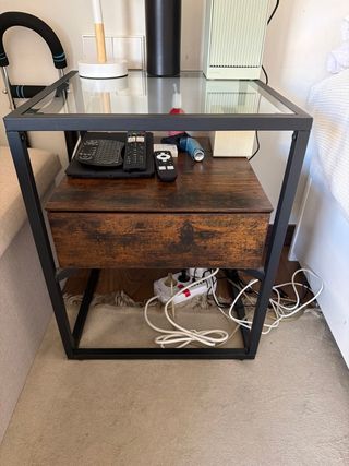Conjunto de dos mesitas de noche con un diseño moderno y funcional. - Estructura metálica resistente. - Encimera de cristal. - Cajón de madera con acabado rústico.