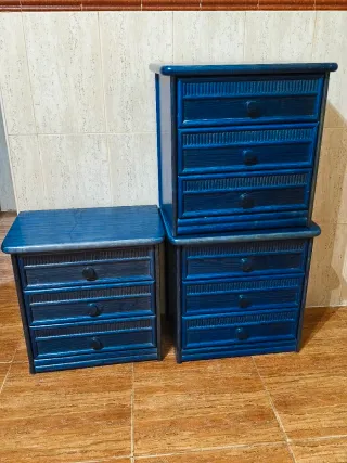 Conjunto de tres mesitas de noche con un diseño rústico y elegante. Perfectas para añadir un toque de color y funcionalidad a tu dormitorio. - Acabado en madera con detalles en azul - Cada mesita cuenta con tres cajones. - Tiradores redondos a juego.