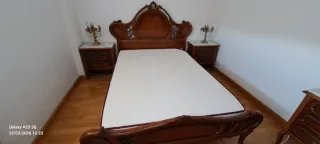 Conjunto de dormitorio de estilo provenzal, fabricado en madera maciza. Incluye somier de 1,80 x1,35 pero la estructura de cama tiene hueco para largo de 1,90. De hecho se ha usado con colchón de 1,90. Regalo colchón 1,80. - Cama con cabecero y piecero tallados. Medidas cabecer 143x123cm (alto). - Mesitas de noche a juego con cajones. Medidas 50x41x63,5cm(alto).