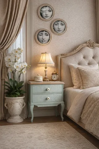 Conjunto de dos cabezales y dos mesitas de noche con un diseño rústico y detalles ornamentales lacados. - Cabezales con relieve floral. - Mesitas con patas verdes y detalles plateados.