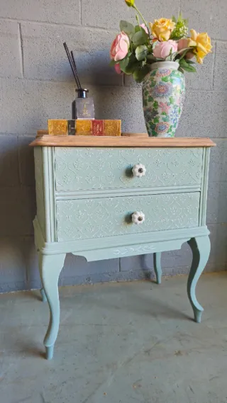 mesita de noche de madera maciza roble y pino pintada a mano en un delicado color verde estilo rustico provenzal frances! Ideal para cualquier rincon de la casa y especial para dormitorio. pieza unica! en muy buen estado! NO NEGOCIABLE! medidas : alto 60cm + 8 cm de moldura largo 49 cm ancho 34 cm *no se envia por wallapop ***opcion de entrega a domicilio solo Barcelona y alrededores Mas muebles en instagram : antique_crafts_bcn #mueble#vintage#envejecido#frances#provenzal#auxiliar#deco#home#mesilla#diseño#maisonsdumonde