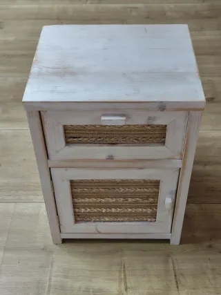 Mesita de noche de madera con un diseño rústico y elegante. Poco usado.c - Frontal de puerta con detalle de mimbre. - Cajón inferior con tirador de madera. La mesilla tiene un cajón en la parte de abajo.