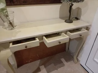 Mesita auxiliar de madera con un diseño clásico y elegante. Cuenta con dos cajones para almacenamiento. - Acabado en madera natural. - Tiradores redondos. 48 cm largo la encimera 33'5 cm ancho del lado 59 cm alto -De patas altas -Se puede ver Se puede pintar de otro color si se desea Se puede enviar Se puede llevar 30 a 70km aproximadamente preguntar precio económico gracias.