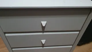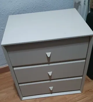 Mesita de noche con 3 cajones. Esta en oerfecto estado solo tiene esa pequeña marca. Los cajones se abren y cierran con un simple toque. Altura 54 fondo 40 ancho 45'5. Hay una cajonera doble de conjunto. No se envia.