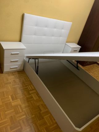 Preciosa cama de matrimonio en color blanco, con cabecero de madera. Incluye somier y colchón. Está en perfecto estado y lista para usar. - Diseño elegante y moderno. - Cabecero de madera de estilo rústico. - Dos mesitas de noche a juego.