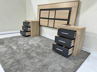 Conjunto de mesitas de noche y cabecero a juego. Opciones de vender cada mesita por 50 euros y el cabecero 100 euros. no incluye colchón. - Diseño moderno y elegante. - Acabado en color oscuro.