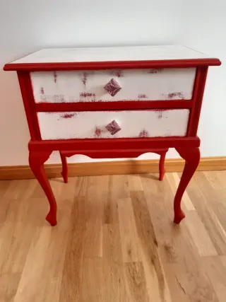 Conjunto de dos mesitas de noche con un diseño vintage. Antiguas mesitas de madera restauradas, puedes volver a pintarlas y dejarlas a tu gusto. Comoda, mueble, aparador, sinfonier, decoración, mesillas, Ikea, Maison du monde, Leroy Merlin, Sklum. - Acabado en rojo y blanco con detalles desgastados. - Patas curvas elegantes. - Tiradores decorativos. Se pueden recoger en Logroño zona Los Lirios o en Burgos ciudad.