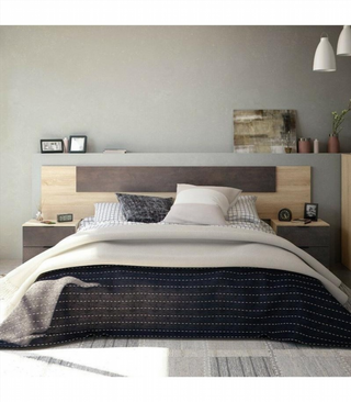 Conjunto de cabecero y mesillas Medidas: Conjunto completo: Alto 95 cm Ancho 247 cm Profundo 38 cm Cabezal: Alto 50 cm Ancho 247 cm Profundo 3 cm Mesitas: Alto 45 cm Ancho 50 cm Profundo 38 cm