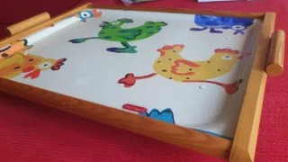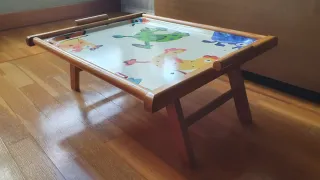 Práctica mesita plegable con un divertido diseño infantil. Ideal para comer en la cama. Espaciosa y sólida. Como nueva. - Estructura de madera. - Superficie de plástico con dibujos de animales. - Patas plegables para fácil almacenamiento.