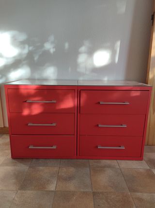 vendo dos mesitas rojas en perfecto estado. Llevan cristal arriba. 3 cajones. 60 euros las dos.