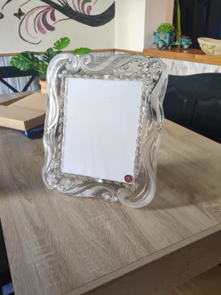 Elegante portafotos con un diseño intrincado y detalles florales. Para fotos de 20x25 cms - Marco de cristal tallado. - Borde decorado con motivos florales y espirales. - Acabado brillante y transparente.