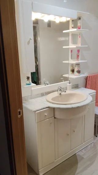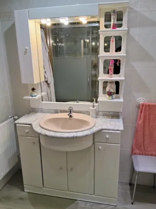 Conjunto de mueble de baño en color beige, con lavabo, espejo y luces. - Mueble de baño muy cuidado. - Lavabo integrado. - Espejo con iluminación superior. - Estanterías decorativas a un lado. - Los cajones y puertas están como nuevos. Tiene un desperfecto, el ribete de abajo engrosado mínimamente por una mojadura- como se ve en la foto.