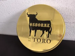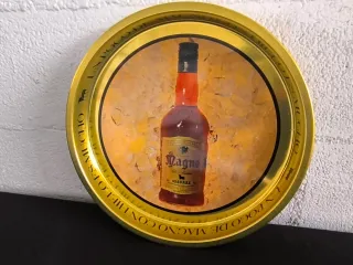Bandeja redonda con un diseño vintage de la marca Magno. - Borde dorado. - Ilustración central con una botella de licor sobre hielo.