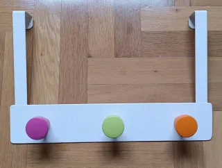 Práctico perchero para colgar en puertas. Ideal para organizar abrigos, bolsos o toallas. - Diseño moderno con tres pomos de colores. - Fabricado en metal resistente. Los pomos son de madera - Tiene un rayón, como se aprecia en la foto