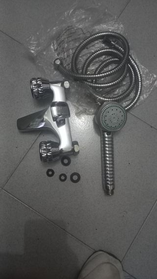 Conjunto de grifo de ducha con manguera y alcachofa. - Grifo de metal y plástico. - Manguera flexible de metal. - Alcachofa de ducha con varios chorros. nuevo
