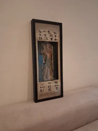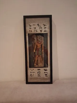 Cuadro decorativo con temática egipcia. - Figura central de personaje egipcio. - Inscripciones jeroglíficas. - Marco de madera y plástico. Medidas: 20×50cm