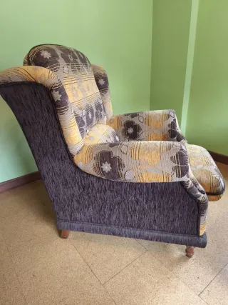 Butacón con un llamativo estampado floral en tonos marrones y amarillos. - Patas de madera. - Tapicería de tela.