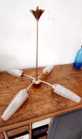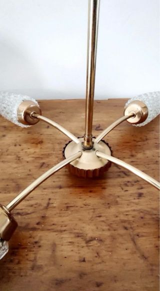 Elegante lámpara de techo estilo Art Decó con un diseño único. - Estructura principal en metal dorado. - Cuatro brazos con tulipas de cristal texturizado grueso -Tiene un casquillo dañado pero funciona -Se entrega con bombillas, en Mieres u Oviedo