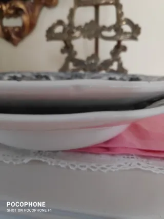 Pequeña bandeja decorativa de porcelana de la marca Santa Clara (Vigo), con detalles florales y borde dorado. - Diseño floral delicado. - Borde con acabado dorado. - Entre 20 y 21 cm de largo.