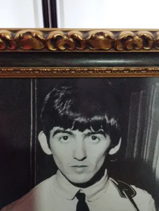 CUADRO GEORGE HARRISON & GRETSCH GUITAR MARCO TALLADO DORADO VINTAGE BLANCO Y NEGRO 065 ANCHO 075 ALTO 005 GROSOR