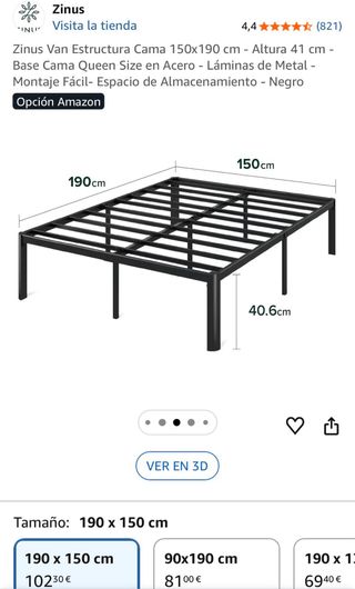 Estructura de cama de metal de la marca Zinus, vendido en amazon. - Medidas: 150x190 cm. - Altura: 41 cm. - Diseño con láminas de metal. - Fácil montaje. - Negro. No se envia