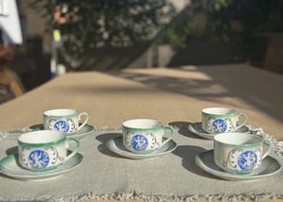 Elegante juego de café de porcelana con un diseño clásico. - Tazas y platillos con detalles en azul y verde. - Acabado brillante.