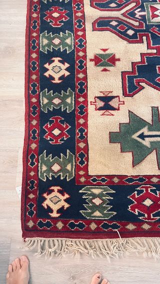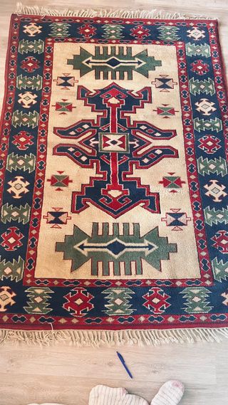 Alfombra de lana con un diseño étnico y vibrante. Su base beige se complementa con patrones en tonos rojos, verdes y azules, creando un punto focal llamativo. - Diseño geométrico central. - Bordes decorativos. - Flecos en los extremos. Grande 1,53 de ancho por 2,15 largo de lana Tiene qlgun fleco despechulado ( ver fotos) y hace una sombra en una parte de la alfombra ( pero no es mancha) ver fotos Venta en persona en malaga marbella fuengirola benalmadena mijas costa etc Oportunidad!! Me mudo vendo todo mira mi perfil y llevate mas cosas por un modico precio gracias