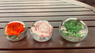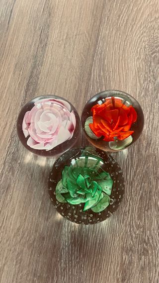 Conjunto de tres bolas de cristal decorativas, cada una con una flor en su interior. - Bola con flor rosa pálido. - Bola con flor roja. - Bola con flor Cada una 6€ todas juntas 12€ ) Venta en persona en malaga marbella fuengirola benalmadena mijas costa etc Oportunidad!! Me mudo vendo todo mira mi perfil y llevate mas cosas por un modico precio gracias