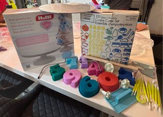 Conjunto de accesorios para repostería que incluye un set de cortadores de galletas con números, figuras y letras, además de una base giratoria para tartas y números de silicona - Base giratoria alta para facilitar el trabajo en repostería. - Set de 100 piezas de cortadores de galletas. Incluye formas de letras, números, animales y objetos. - moldes de silocona de números - cortador - espatula para alisar -utensilios para modelar -cortadores de copos de mieve -base para tartas 1 - palos de madera p