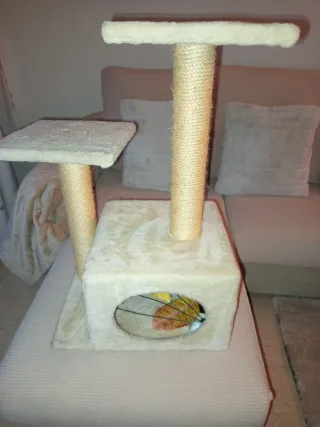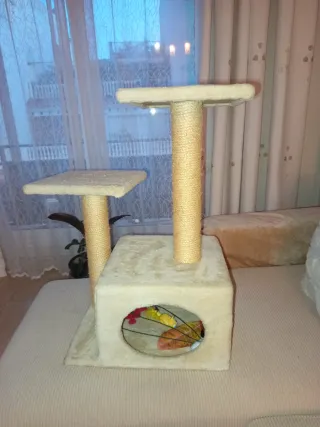 Rascador para gatos con varios niveles y postes para arañar. - Plataformas cubiertas de tela suave. - Postes envueltos en sisal para afilar las uñas. - Incluye una casita para descansar.