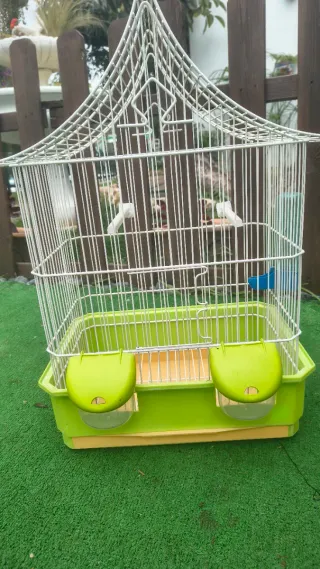 Jaula para pájaros con base y accesorios. - Estructura de alambre blanco. - Base y comederos de plástico verde. - Incluye dos comederos. - Bebedero azul acoplado. Jaula medidas 52 hasta el pico y ancho 32 de jaula y de caja de abajo 35