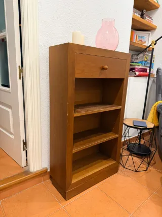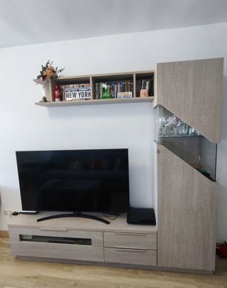 Mueble de salón nuevo sin usar en su caja, con un diseño moderno que combina acabados en madera Peral y blanco brillante. Cuenta con espacios de almacenaje abiertos y un cajón grande. Vendo x mudanza, recogida en Miraflores de la Sierra. - Diseño contemporáneo. - Combinación de texturas y colores.