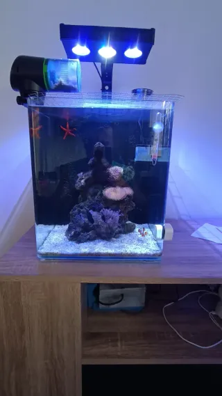 nano reef, ideal para iniciarse en este hobby. Incluye todo lo necesario para empezar. - Iluminación LED azul. - Filtro integrado. -Mini skimer - Bomba de circulación. - Calentador. - Termómetro. - Comedero automático. - Decoración rocosa y sustrato. -pez mandarin - Un pez payaso. -2 anémonas -3 corales