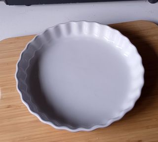 Molde redondo de cerámica con un diseño ondulado en el borde. - Material: Cerámica. - Color: Blanco y gris.