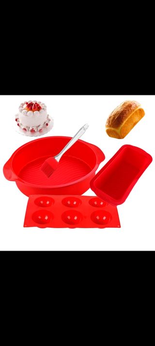 Set de moldes y utensilios de silicona para repostería. - Molde redondo para tartas, 26 cm. de diámetro - Molde rectangular para bizcochos, 24x12 cm. - Brocha de silicona. - 2 espátulas de silicona.