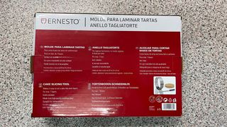 Molde de acero para laminar bizcochos y tartas de forma homogénea. Incluye la base y un gran cuchillo con sierra de 38 cm aprox. Para cortar tartas de entre 24 y 33 cm. Se puede meter en el lavavajillas.