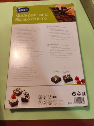 Molde de silicona para horno , CASSETTI. Para preparar bizcochos y bombones , también se puede guardar en el congelador. Silicona flexible y resistente al calor. Efecto antiadherente máximo sin necesidad de engrasarlo. Resistente al ácido de las frutas. Termorresistente entre -40°C y 240°C. Nunca se ha usado.