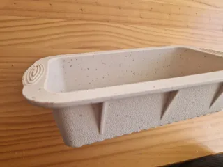 Molde para bizcocho o budín con un diseño interior ondulado. - Material de silicona flexible. - Color beige con motas. - Asas laterales para facilitar el manejo. - Medidas: 20 × 10 × 6 cm.