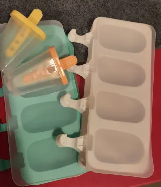 Set de moldes para hacer helados caseros. Incluye dos moldes de silicona y 2 recipientes individuales. - Dos moldes grandes de silicona color verde y blanco. - Recipientes individuales con tapas de colores (amarillo y naranja). Con un pack de palitos de madera.