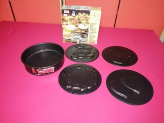 Esto es un molde desmontable para hornear, comúnmente usado para hacer tartas, pasteles y cheesecakes. Tiene un mecanismo de cierre en el lateral que permite separar la base del aro exterior, facilitando el desmolde sin dañar el postre. Es un utensilio muy útil en repostería. Tiene algún arañazo por haber cortado un pastel ... Pero está como nuevo.