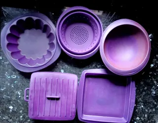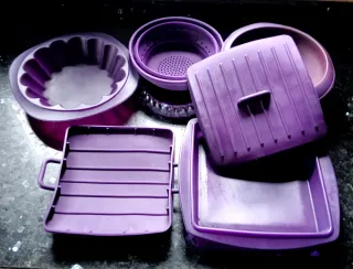 Set de SEIS (6) moldes para repostería de silicona flexible de alta calidad, de color morado, perfectos para hornear, 100% para que así no se deformen.🟪🥮 Estos sirven lo mismo para horno que para microondas, ya que soportan altas temperaturas y son fáciles de guardar por su flexibilidad. El set está compuesto por: -1 molde colador redondo. -1 molde redondo para flan o/y bizcocho.🟣🍮 -1 molde redondo para bizcocho.🥧 -1 molde de bandeja con asas laterales y su tapa. Se encuentran en perfecto estado.