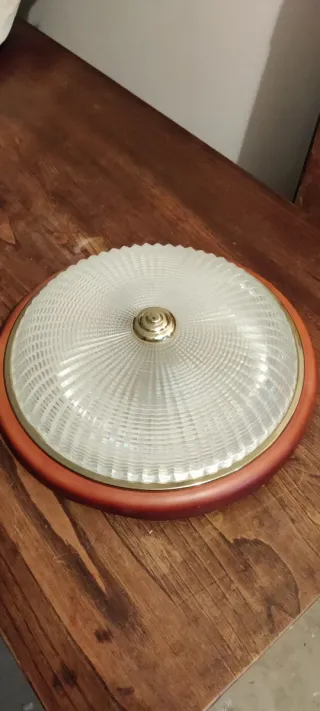 Elegante plafón de techo con un diseño circular. - Base con acabado en tono marrón. - Cúpula de cristal texturizado. - Detalle central metálico dorado. - Dos bombillas estándar