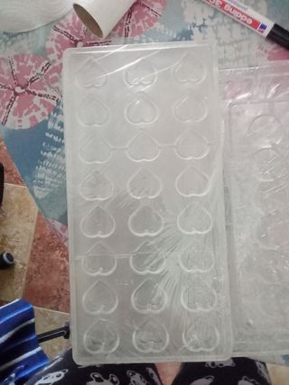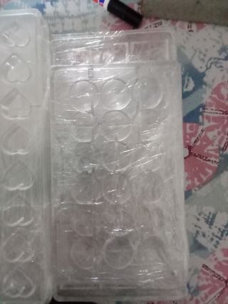 Molde rígido para bombones de plástico transparente. Ideal para hacer bombones. Se incluyen cuatro moldes: semiesferas, corazones, rectángulos y cilindros. Están en buen estado, listos para usar. Material plástico resistente.