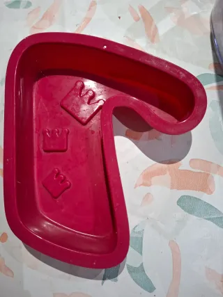 Molde con forma del número 7, ideal para pasteles de cumpleaños o celebraciones. - Diseño con tres coronas. - Fabricado en plástico silicona resistente al horno. - Usado una vez para cumpleaños de mi hija.