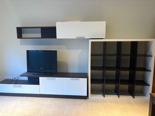 Se vende conjunto de muebles de salón por mudanza. Incluye mueble de televisión,estantería,mesa de comedor con sillas y sofa - Mueble de TV con cajones y compartimentos. - Estantería modular con múltiples divisiones. - Diseño moderno en blanco y negro.