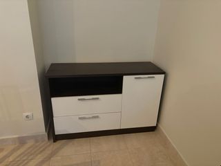 Mueble de madera maciza con un diseño elegante. - Amplio espacio de almacenamiento. - Puerta con tirador. - Cajones con tiradores.