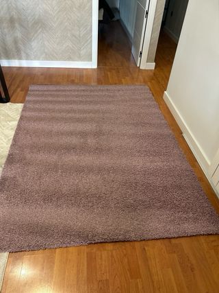 Alfombra de tela con un diseño moderno y acogedor. - Tonos púrpura y beige que combinan fácilmente. - Textura suave y agradable al tacto.