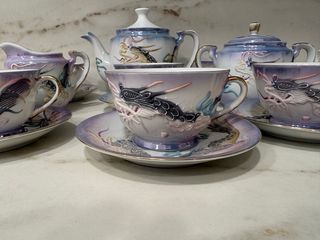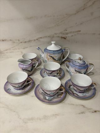 Precioso juego de té chino de porcelana, decorado con dragones en relieve y esmalte en tonos lila, azul y blanco, con detalles dorados. Muy decorativo y elegante, ideal tanto para usar como para colección o decoración. El conjunto incluye: 1 tetera grande 1 azucarera 1 lechera 6 tazas 6 platos Total: juego completo de 15 piezas. Las piezas están en muy buen estado, sin grietas ni roturas. Decoración en relieve bien conservada. Se ha cuidado siempre en vitrina.