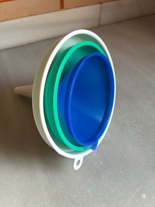 Set de tres embudos de diferentes tamaños. - Embudo azul - Embudo verde - Embudo blanco