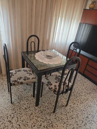 Conjunto de mesa y cuatro sillas con un diseño moderno. - Mesa con sobre de cristal. - Sillas con tapicería floral. - Estructura metálica.